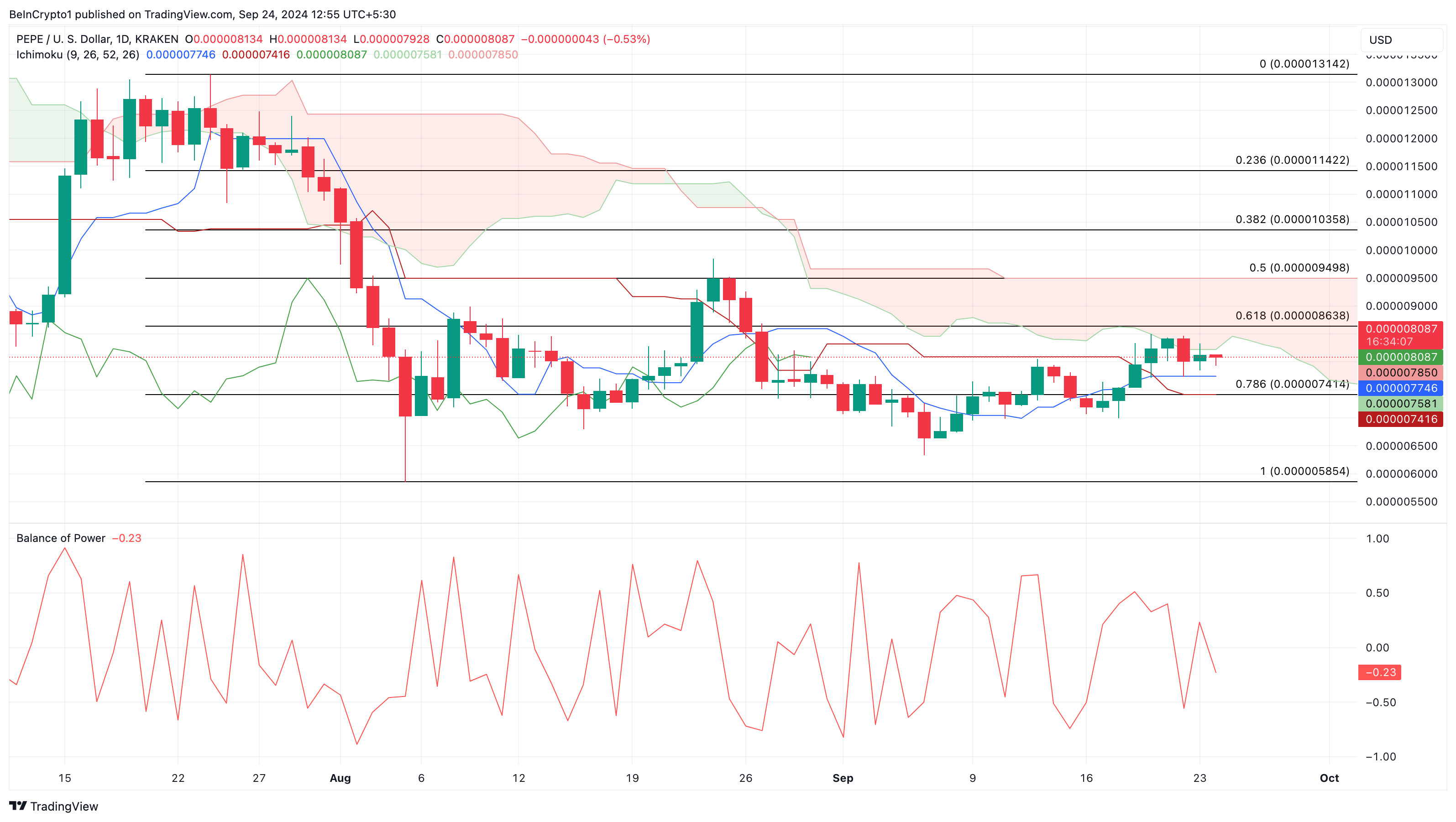Vanuit technisch oogpunt toonde PEPE’s koers bereidheid om op een gegeven moment naar $0,000013 te bewegen. Dit zou een stijging van 63% vanaf de huidige niveaus hebben betekend. Echter, aanwijzingen van de Ichimoku Cloud, evenals de Balance of Power (BoP), onthullen dat de cryptocurrency mogelijk een terugval zal ondervinden.