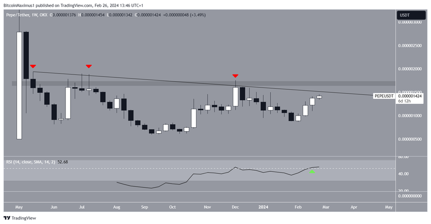 De technische analyse van het wekelijkse tijdsframe laat zien dat de koers van PEPE sinds mei 2023 is gedaald onder een dalende weerstandstrendlijn op de lange termijn. De daling leidde tot een low van $0,00000059 in september. Sindsdien is de koers van PEPE gestegen.