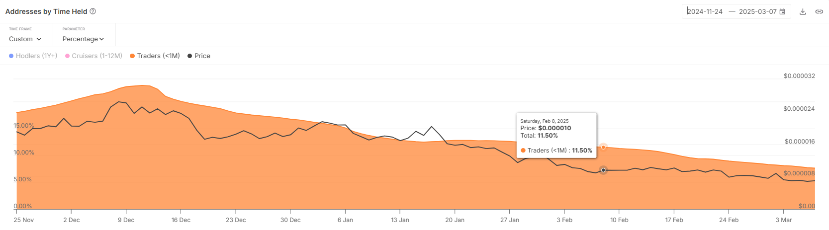 Korte-termijn houders (STH’s) hebben de markt de afgelopen maand verlaten. Hun deelname is gedaald van 11,5% naar 7%, een daling van 4,5% die de groeiende terughoudendheid om met PEPE te handelen bij de huidige koersniveaus weerspiegelt.