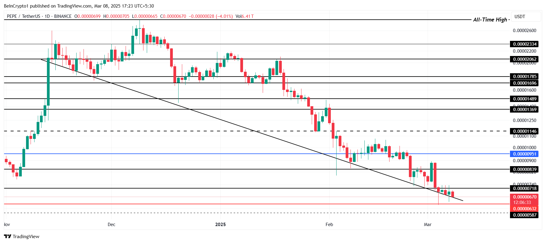 De PEPE downtrend gaat door