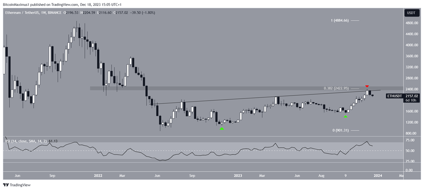 Gedurende deze tijd volgde de ETH koers een stijgende weerstandstrendlijn. Meer recent werd de trendlijn twee weken geleden gevalideerd toen ETH zijn jaarlijkse high van $2.400 bereikte (rode pijl).