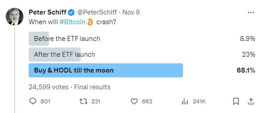 Schiff vroeg zijn volgers of er een Bitcoin crash vóór of na de lancering van een Bitcoin exchange-traded fund (ETF) zou plaatsvinden. De resultaten lieten een voorkeur van na de lancering zien. In tegenstelling tot 8% die voorspelde dat het vóór de lancering zou gebeuren, verwacht maar liefst 23% een Bitcoin crash na de lancering.