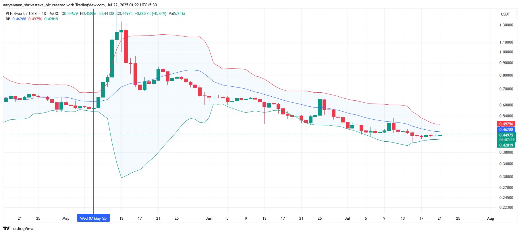 Op dit moment komen de Bollinger Bands van Pi Coin dichter bij elkaar, wat vaak wijst op aankomende volatiliteit. De laatste keer gebeurde dit in mei, waarna Pi Coin een stijging van 114% doormaakte zodra de banden zich uitbreidden. Of dit zich herhaalt, hangt af van de bredere cryptomarkt.