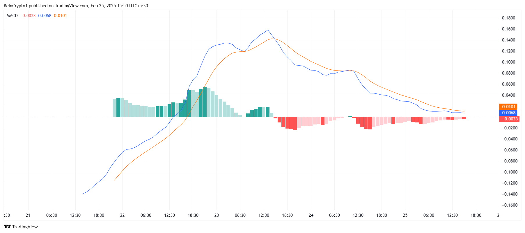 Pi Coin wordt ook geconfronteerd met sterke macro-economische tegenwind in de vorm van een bearish crossover. De Moving Average Convergence Divergence (MACD) heeft de afgelopen 36 uur een bearish crossover waargenomen, wat meestal aangeeft dat verdere neerwaartse prijsbewegingen waarschijnlijk zijn.