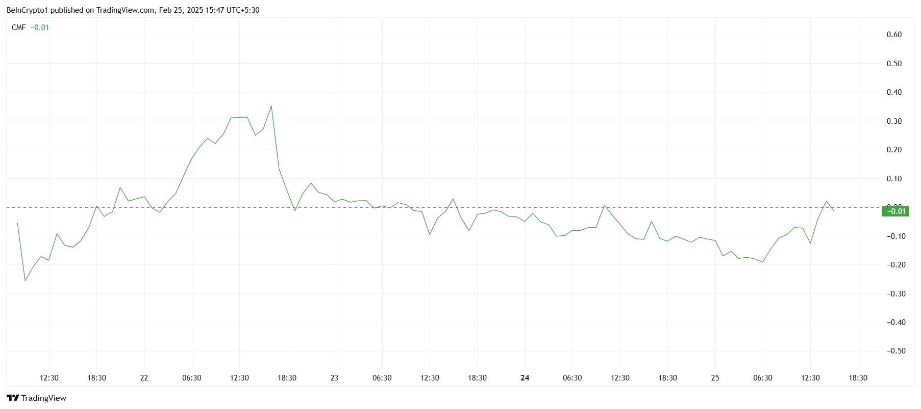 Dit is duidelijk te zien in de piek van de indicator. Ondanks deze instromen zal een echte bullish bevestiging plaatsvinden wanneer de CMF de nul-lijn overschrijdt, wat duidt op aanhoudend positieve momentum en investeerdersvertrouwen in het herstel van Pi Coin.