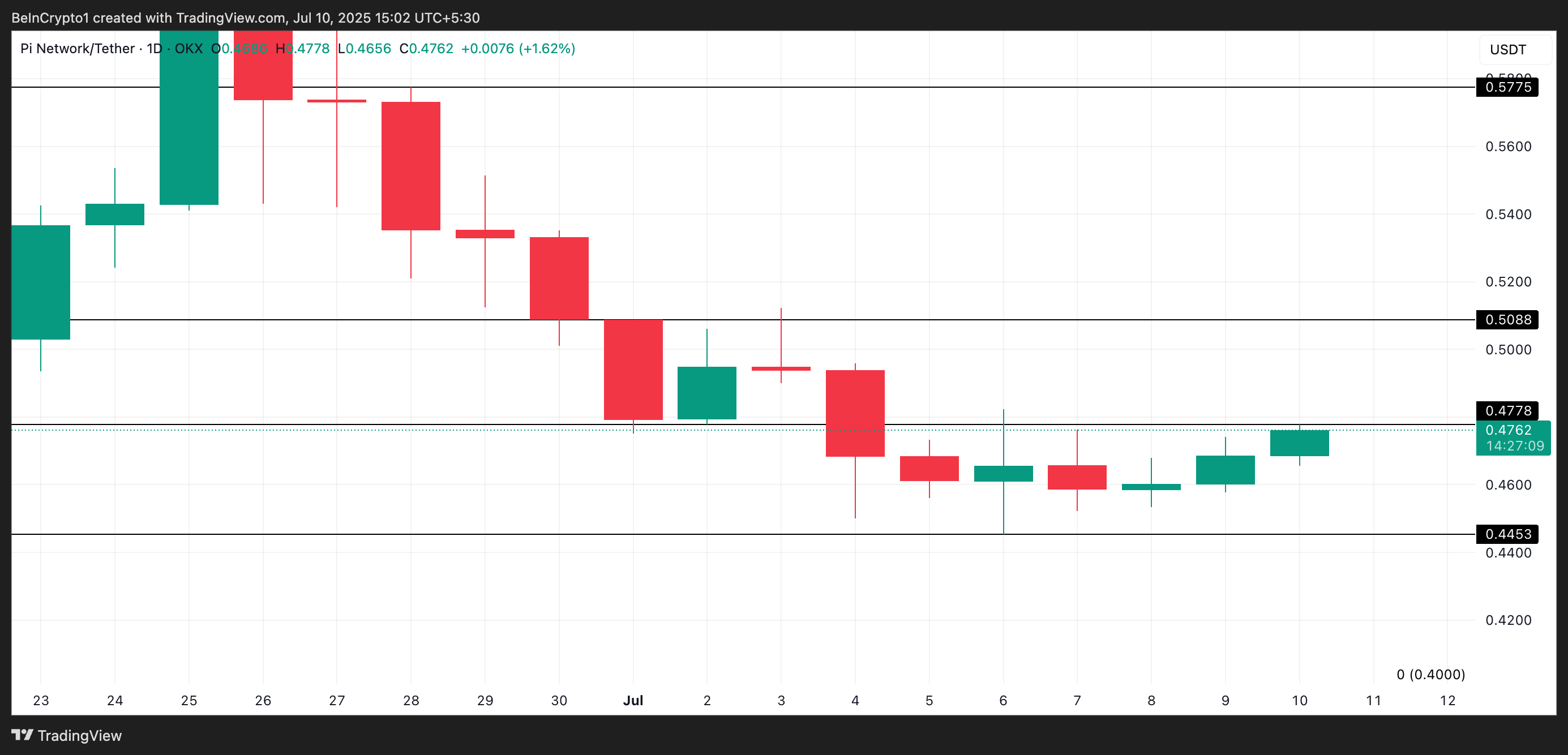 PI handelt momenteel onder weerstand op $0,477. Als de vraag stijgt, zou de altcoin deze barrière kunnen omzetten in een steunvloer, waardoor de koers naar $0,508 kan stijgen.