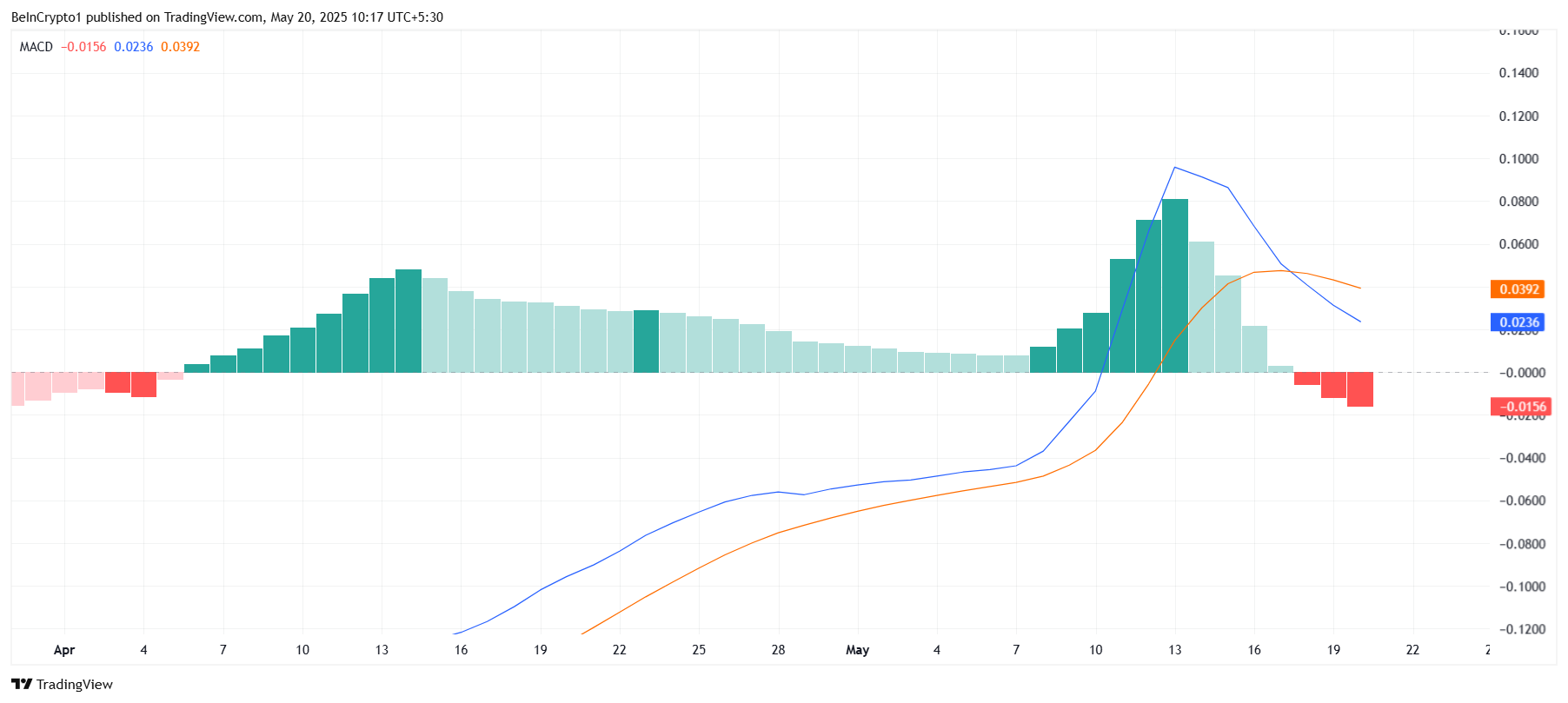 Technische indicatoren ondersteunen een bearish verwachting voor Pi Network. De MACD, die momentum en trendveranderingen volgt, toonde onlangs zijn eerste bearish crossover in meer dan een maand. Deze verschuiving geeft aan dat het algemene momentum van Pi Network negatief wordt.