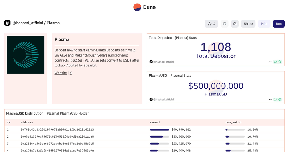 “Alles in overweging genomen, een ongelooflijk goede distributie van houders voor Plasma bij een totale depositogrootte van $500 miljoen. Veel mensen met kleinere bedragen hier en slechts één entiteit met $50 miljoen in een wallet. Goed gedaan,” verklaarde hij in een bericht.