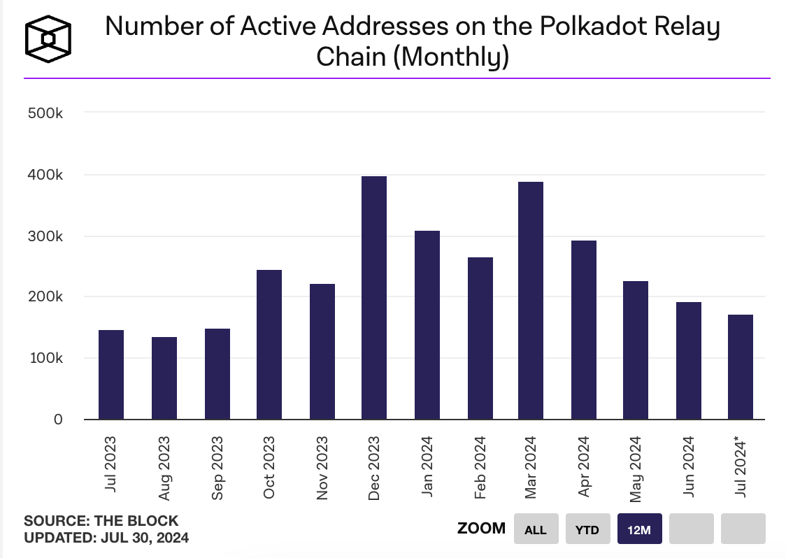 Volgens data van The Block hebben 170.111 actieve adressen deze maand minstens één transactie voltooid op Polkadot’s Relay Chain, als verzender of ontvanger. Dit is het laagste maandelijkse aantal actieve gebruikers sinds het begin van het jaar.