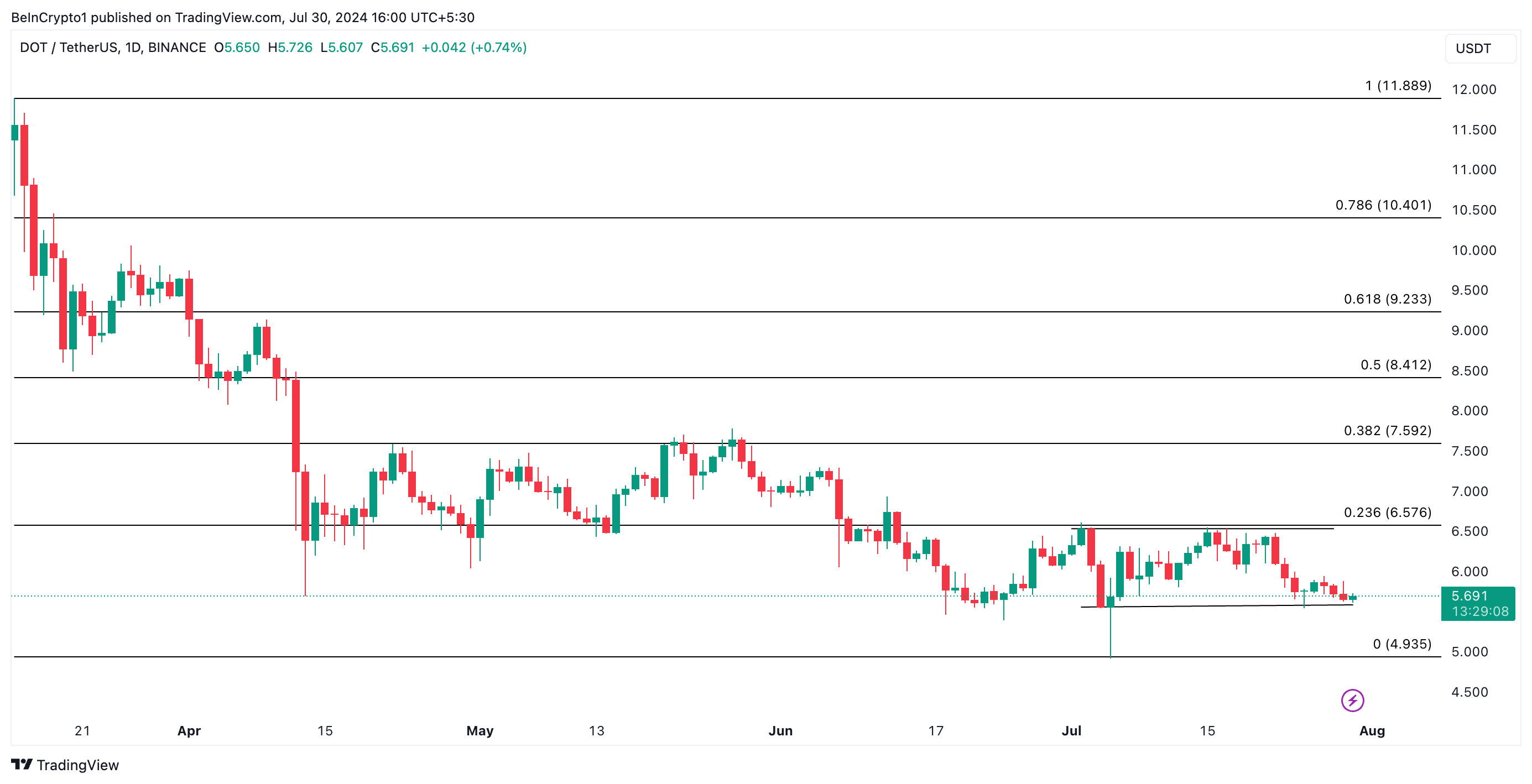 Op het moment van schrijven handelt DOT op $5,68. De koers van de coin handelt sinds begin juli binnen een horizontaal kanaal.