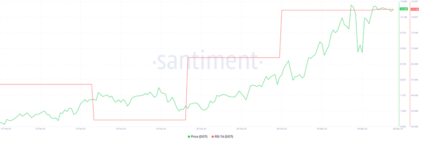 De laatste keer dat het DOT RSI-niveau 74 overschreed, volgde er niet meteen een correctie. In feite steeg de koers daarna van $6,12 naar $9,07. Na die piek daalde de koers echter. Na die piek daalde de koers echter in 7 dagen naar $6,71, een correctie van 26%.