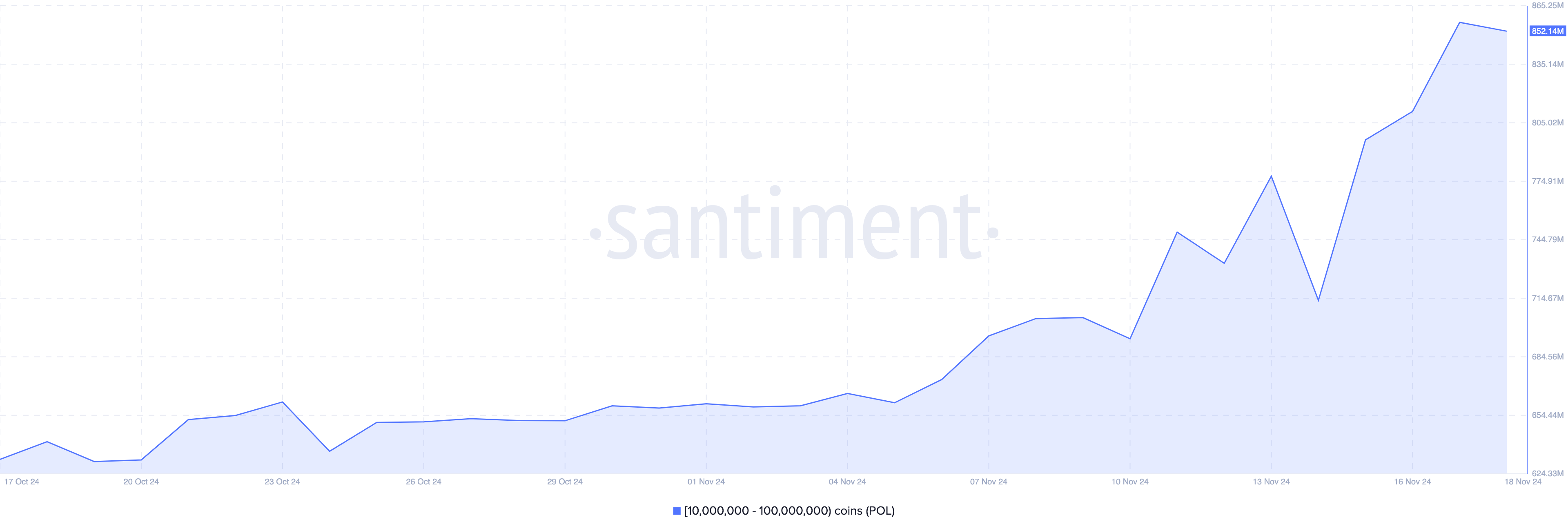 Op 11 november hadden adressen die tussen de 10 miljoen en 100 miljoen POL-tokens in hun wallet hadden, gezamenlijk 695,38 miljoen tokens. Vandaag is dat aantal gestegen naar 852,14 miljoen, wat aantoont dat Polygon whales meer dan 113 miljoen tokens hebben verzameld in de afgelopen zeven dagen.