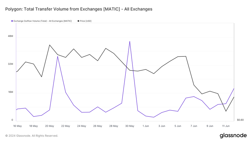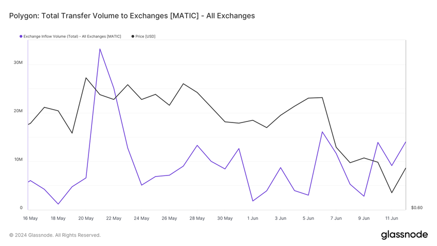 Deze forse stijging duidt op een stijgende bedrijvigheid en mogelijk verhoogde verkoopdruk. Gedurende deze periode vertoonde het instroomvolume aanzienlijke dagelijkse schommelingen. Met name op 6 juni piekte het volume dramatisch met 13 miljoen MATIC.