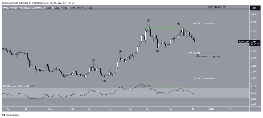 Als de koers van MATIC blijft dalen, wordt het waarschijnlijke doel voor de onderkant van de C-golf geïdentificeerd bij het 0,618 Fibonacci retracement steunniveau, gelegen op $0,68. Deze projectie stelt een 1:1 verhouding vast tussen golf A en C, wat neerkomt op een daling van 13%.