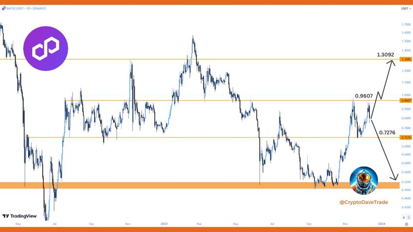 Crypto Dave suggereert dat de koers waarschijnlijk $1 zal bereiken, maar hij zal bearish worden als er een daling onder $0,72 plaatsvindt. Hij tweette:
