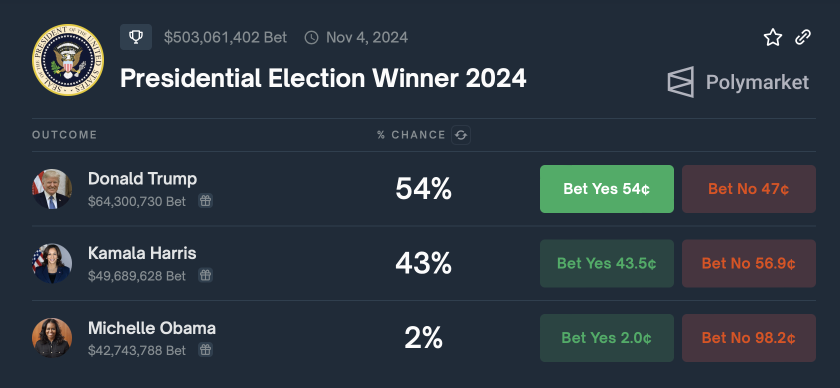 Republikeinse kandidaat Donald Trump leidt met 54% succeskansen. Daarentegen staat Kamala Harris op 43%, terwijl voormalig Amerikaanse First Lady Michelle Obama 2% kansen heeft.