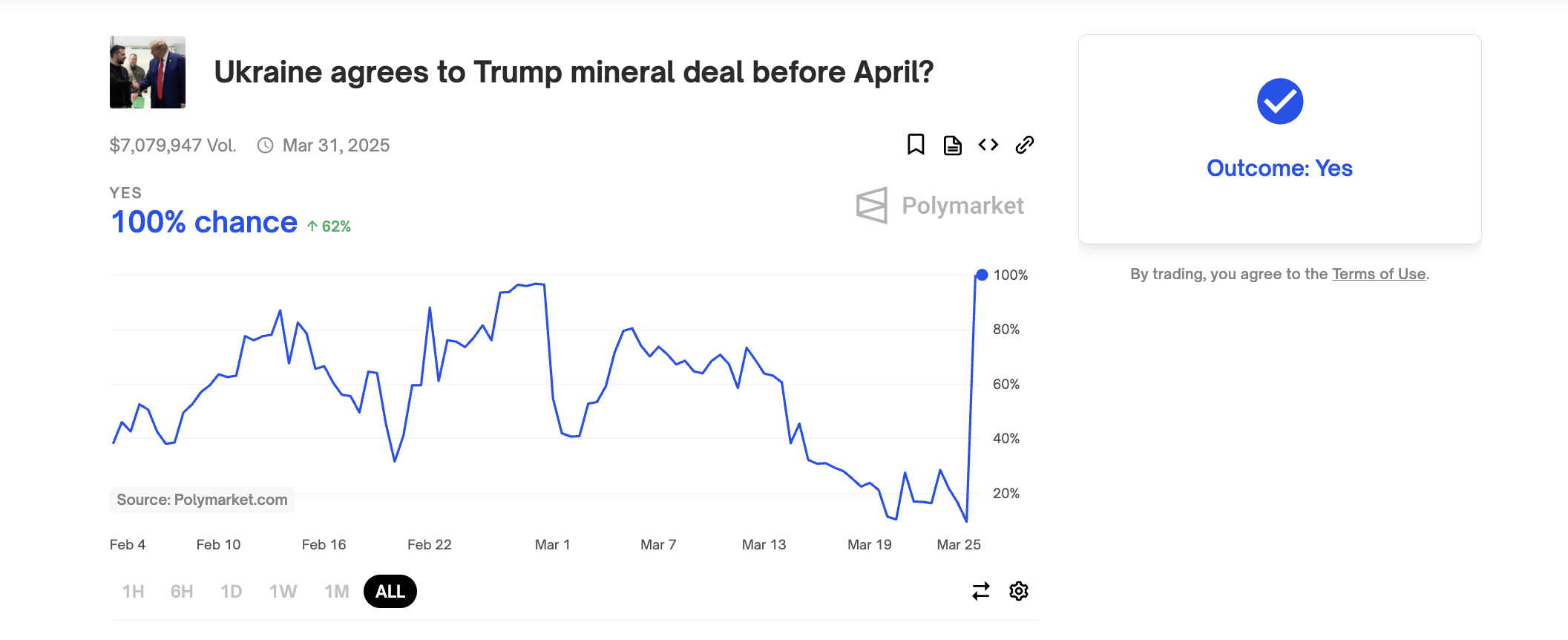 Oekraïne stemt in met Trump mineralen deal voor april. Bron: Polymarket