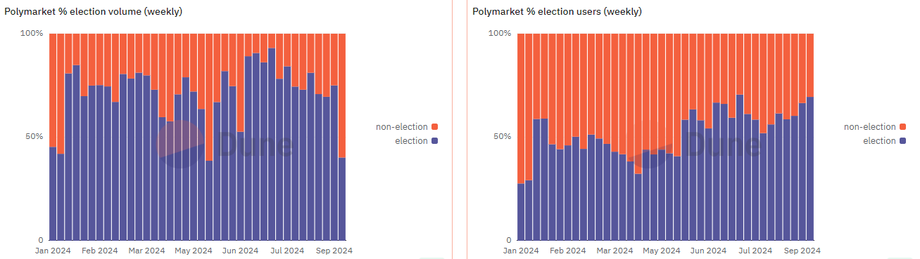 Data van Dune toont aan dat bijna 70% van de wekelijkse gebruikers van Polymarket zich richt op verkiezingsgerelateerde weddenschappen, terwijl de overige 30% bestaat uit niet-verkiezingsgebruikers. Dit benadrukt de centrale rol van politieke evenementen in het stimuleren van betrokkenheid op het platform.