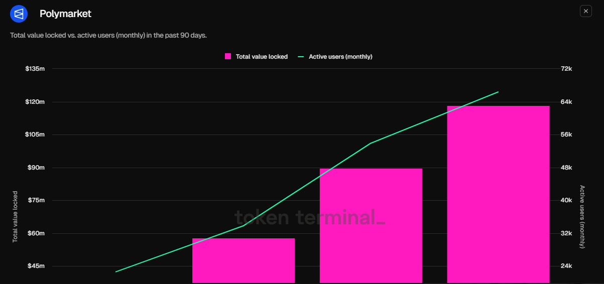 Andere belangrijke metrieken van Polymarket hebben aanzienlijke groei getoond. De totale waarde vergrendeld (TVL) op het platform is sinds juni met 277% gestegen en bereikte bijna $120 miljoen. Bovendien is het aantal maandelijks actieve gebruikers met 50% gestegen, tot 66.400 in dezelfde periode.