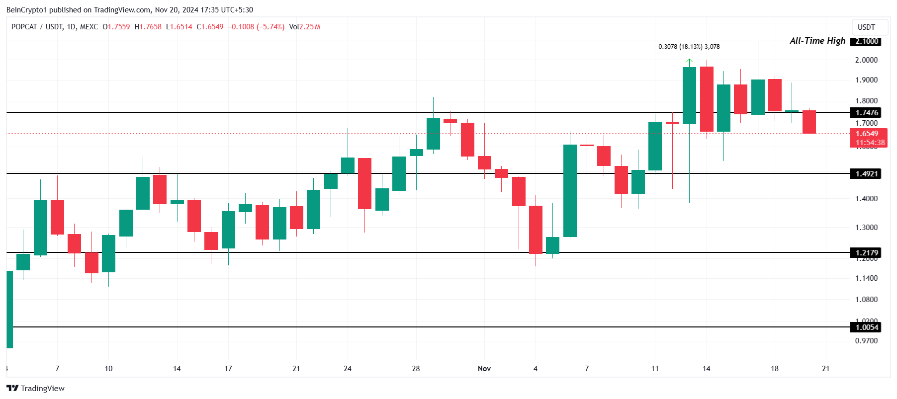 De koers van POPCAT is aanzienlijk gedaald vanaf zijn all-time high (ATH) van $2,10 en handelt momenteel op $1,65. Deze daling zorgde ervoor dat de meme coin onder het kritieke ondersteuningsniveau van $1,74 viel, een belangrijke marker voor het behouden van opwaartse beweging.