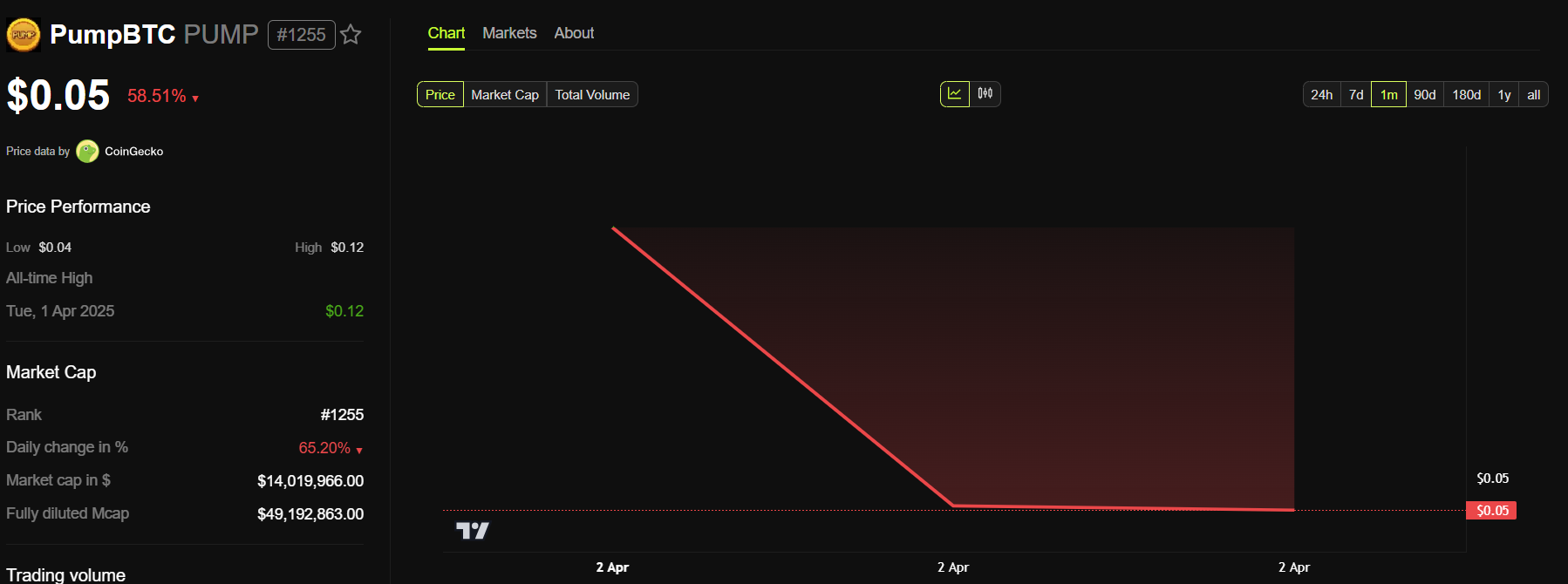 PumpBTC (PUMP) gelanceerd met hoge verwachtingen, bereikte een piekkoers van $0,118. Echter, binnen slechts 24 uur is de koers van PUMP met meer dan 60% gedaald.