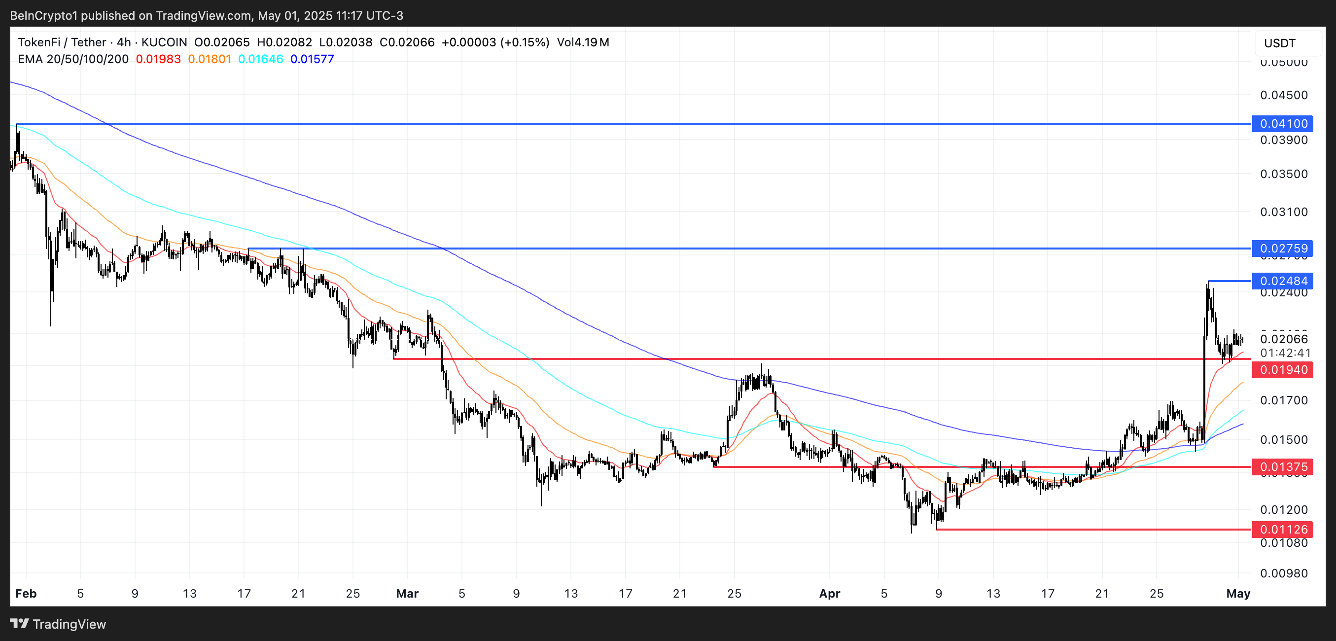 Echter, elke ommekeer zou TOKEN kunnen laten terugvallen naar het steunniveau van $0,0194. Als dat niet standhoudt, liggen er diepere neerwaartse niveaus op $0,0137 en $0,0112.