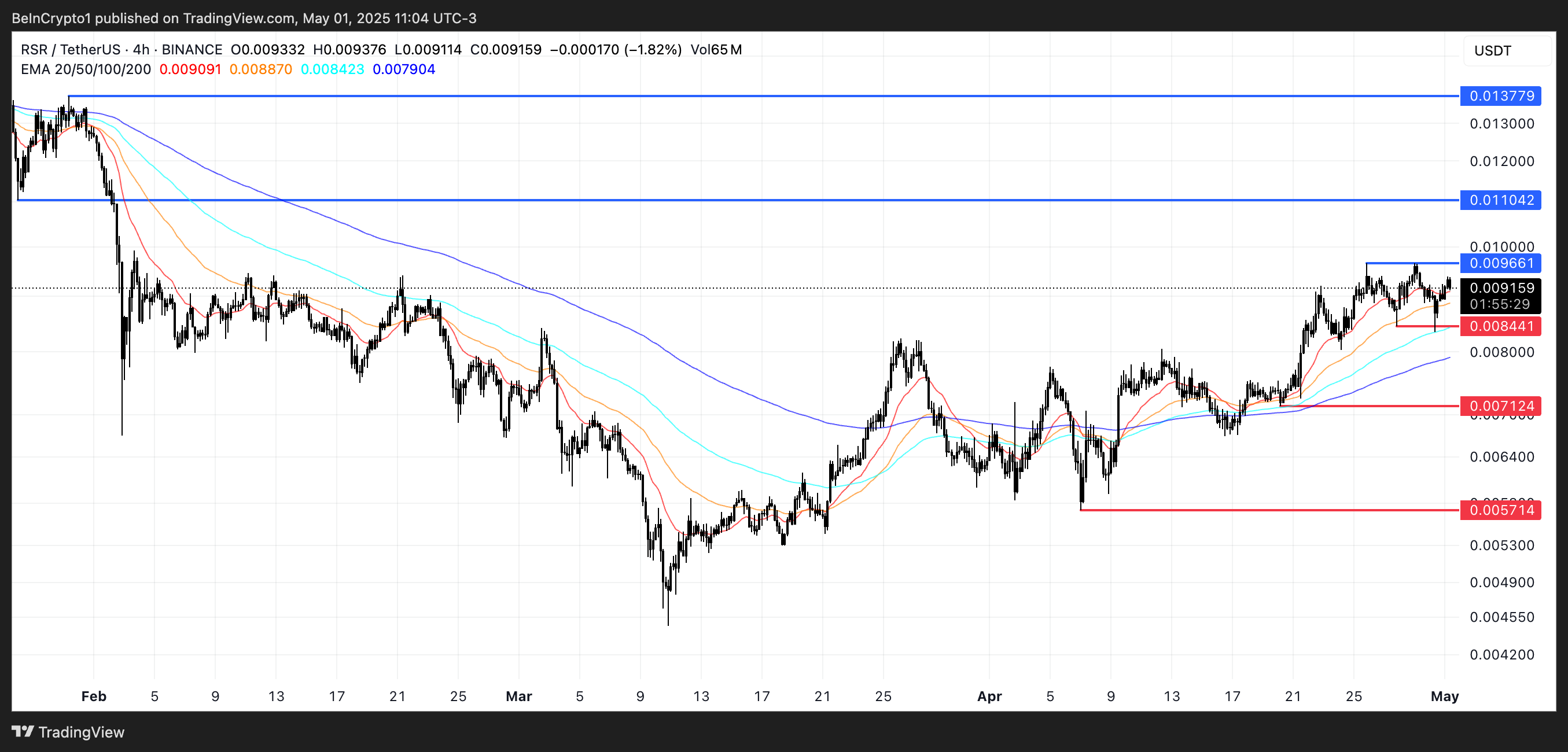 Technisch gezien nadert RSR een kritisch beslissingspunt. De token heeft onlangs twee keer geprobeerd om het weerstandsniveau van $0,0096 te doorbreken en faalde, wat het belang van die drempel aangeeft.