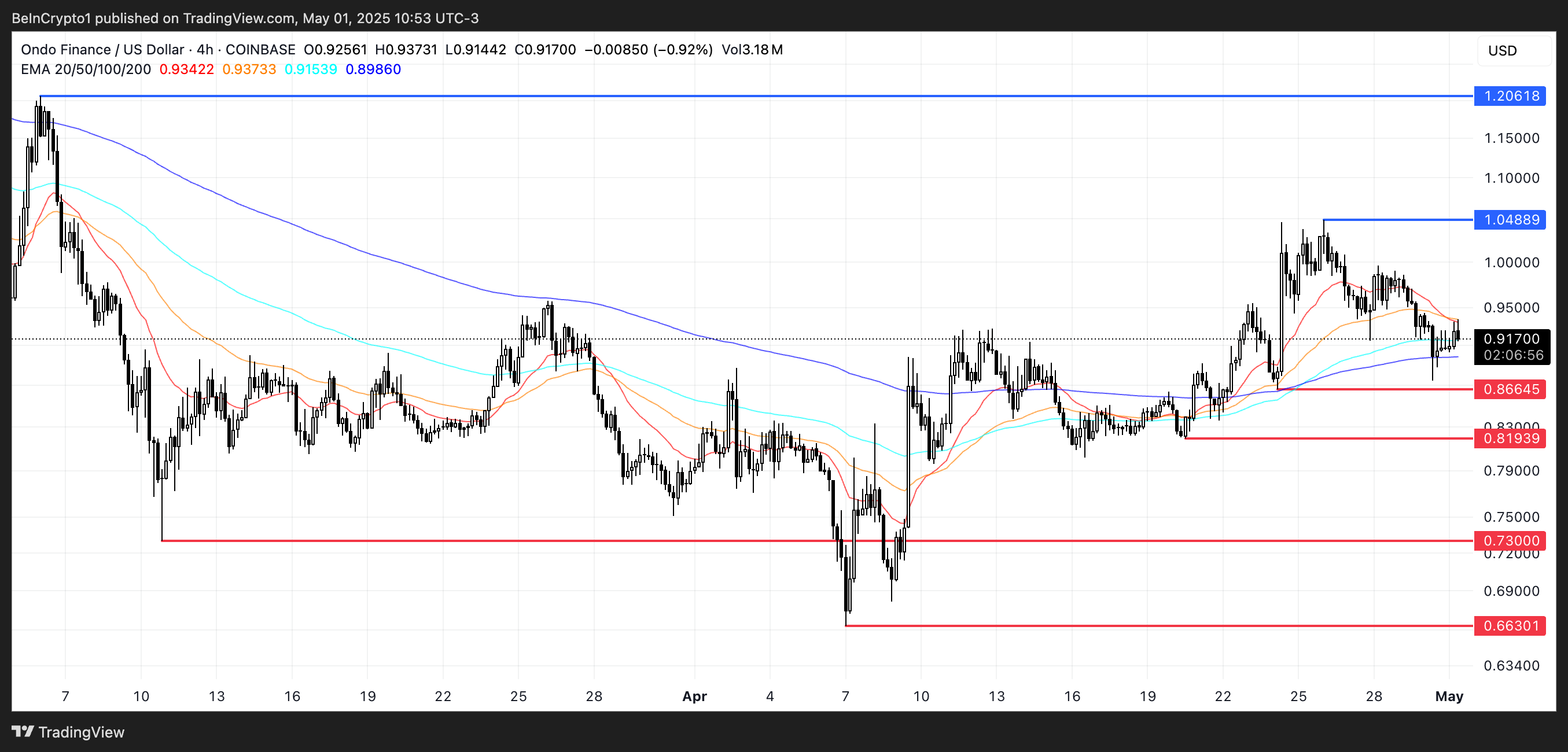 De eerste belangrijke steun is $0,866. Als dat niveau breekt, kan ONDO dalen naar $0,819, met diepere steun op $0,73 en $0,663 als de neerwaartse trend versnelt.