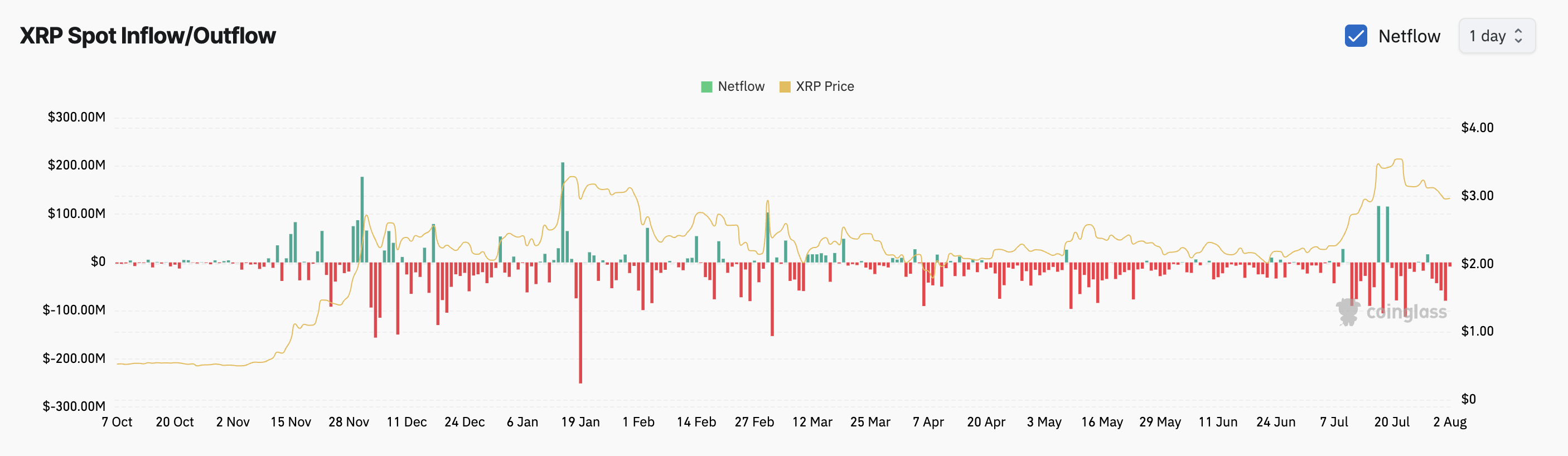 De trend is niet anders onder spotmarktdeelnemers. Volgens Coinglass-gegevens heeft XRP negatieve netflows van meer dan $222 miljoen geregistreerd sinds 29 juli, wat wijst op aanhoudende verkoopdruk en zwakke koopdruk.