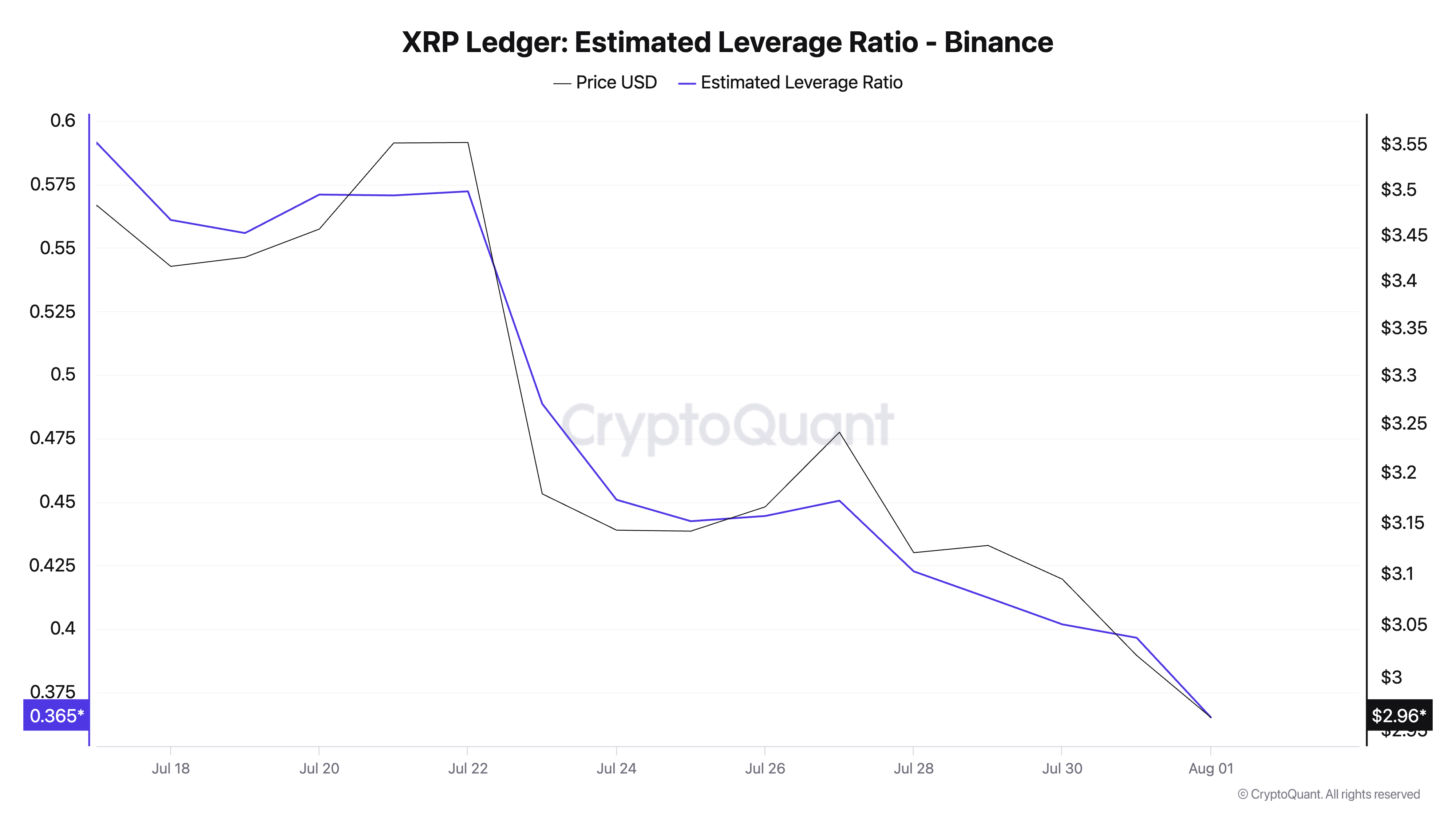 De dalende Estimated Leverage Ratio (ELR) van XRP op Binance weerspiegelt het afnemende vertrouwen en de verminderde risicobereidheid van investeerders. Volgens CryptoQuant staat de ELR nu op 0,36 – de laagste wekelijkse afsluiting in een maand.