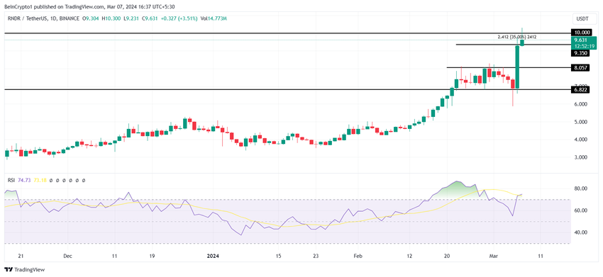 De koers van Render is in een dag tijd met 35% gestegen en daarmee heeft de altcoin een nieuwe all-time high bereikt. Zelfs op het moment van schrijven toont de daily chart een groene candlestick die de high van $10,30 bereikt gedurende de dag.