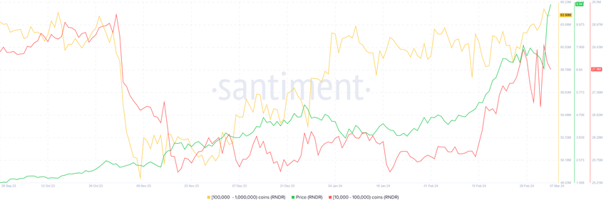 Ook in het verleden, telkens wanneer de Render koers een nieuwe high bereikte of aan een bull run begon, verkochten de whale adressen, die tussen de 10.000 en 1 miljoen RNDR tokens bezaten, hun holdings.