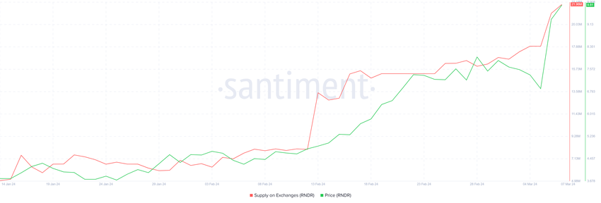 De stijging bracht ook winst voor alle holders van RNDR, met 100% van het circulerende aanbod in de winst. Natuurlijk sprongen investeerders om winsten te boeken voordat er correcties kwamen. Dit sentiment is terug te zien in de stijging van het aanbod van RNDR op alle exchanges.