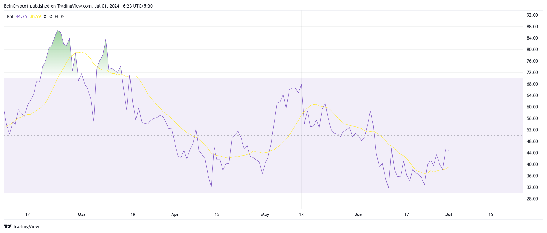De Render koers kijkt niet uit naar een rechte rally vanwege de Relative Strength Index (RSI). De indicator blijft hangen in de bearish zone, wat een aanhoudend negatief momentum en een gebrek aan koopdruk weerspiegelt. Dit suggereert dat de token nog niet de kracht heeft die nodig is om een sterke opwaartse beweging te initiëren.