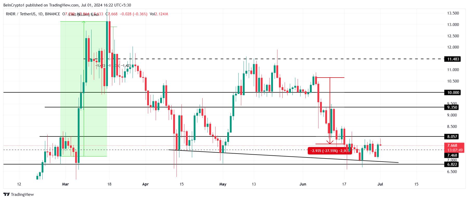 Een breakout, hoewel moeilijk, zou kunnen plaatsvinden als de weerstand op $8,0 wordt doorbroken. Dit zou RNDR richting $9,0 en hoger kunnen sturen om de winst terug te winnen die verloren ging tijdens de crash begin juni.