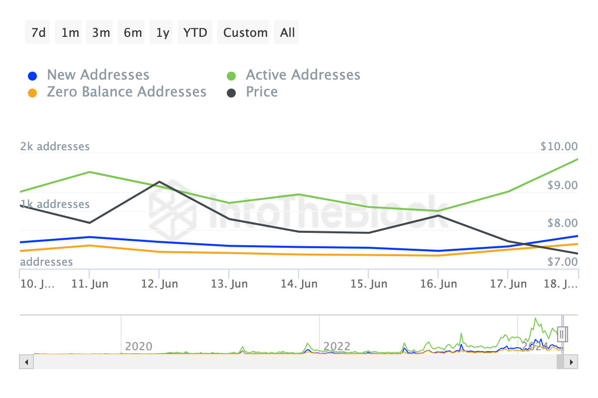 Een daling van het aantal nieuwe adressen wijst echter op een gebrek aan nieuwkomers en een verlies aan tractie. Voor RNDR steeg het aantal nieuwe en zero-balance adressen met respectievelijk 3,47% en 6,75% in de laatste zeven dagen. Dit betekent dat de adoptie de pan uit rijst, wat een verdere koersstijging voor de token kan ondersteunen.