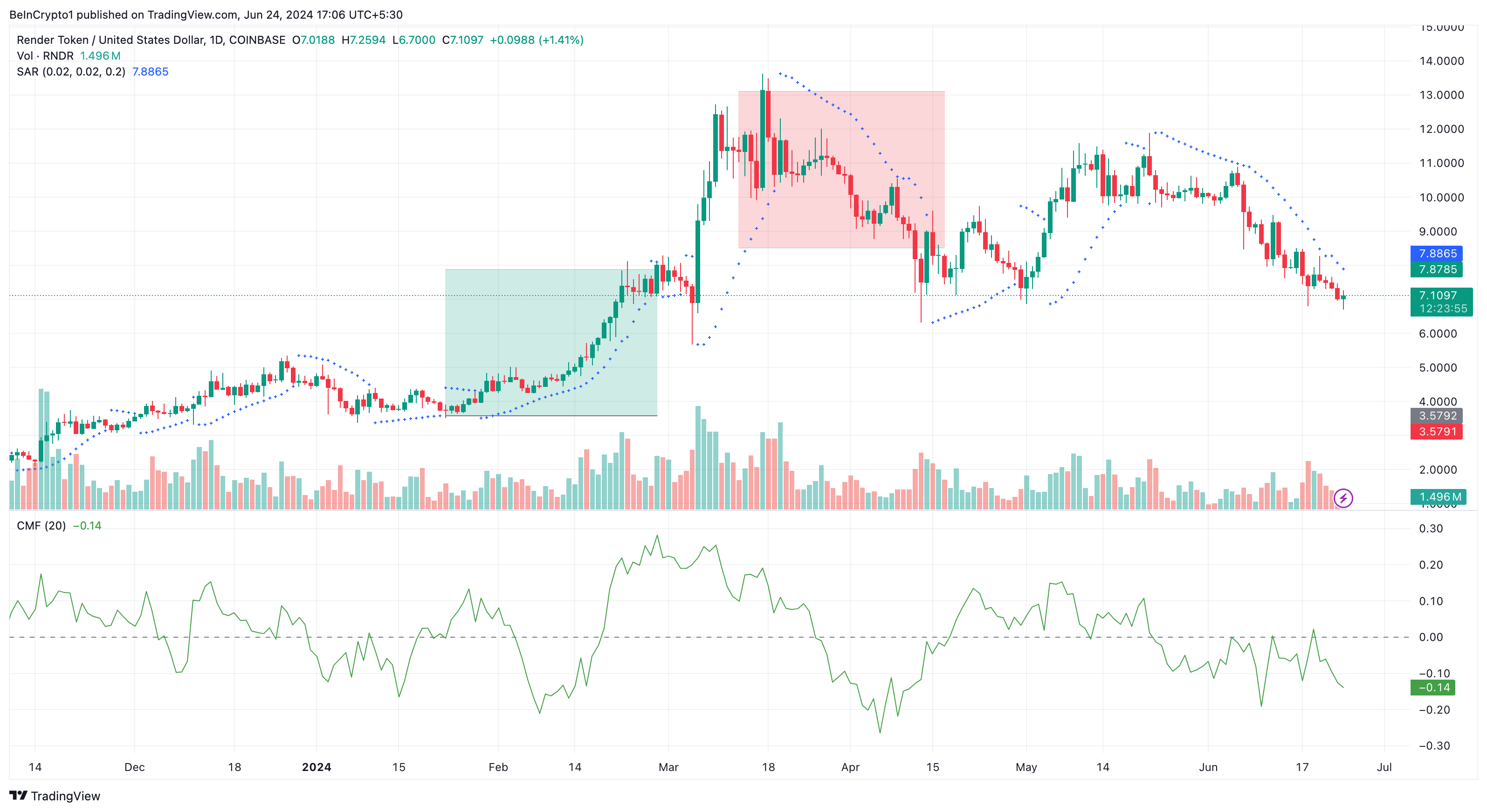 Vanuit een technisch perspectief analyseert BeInCrypto de Render koers op de dagelijkse grafiek. Twee indicatoren die hierbij helpen zijn de Chaikin Money Flow (CMF) en de Parabolic SAR.