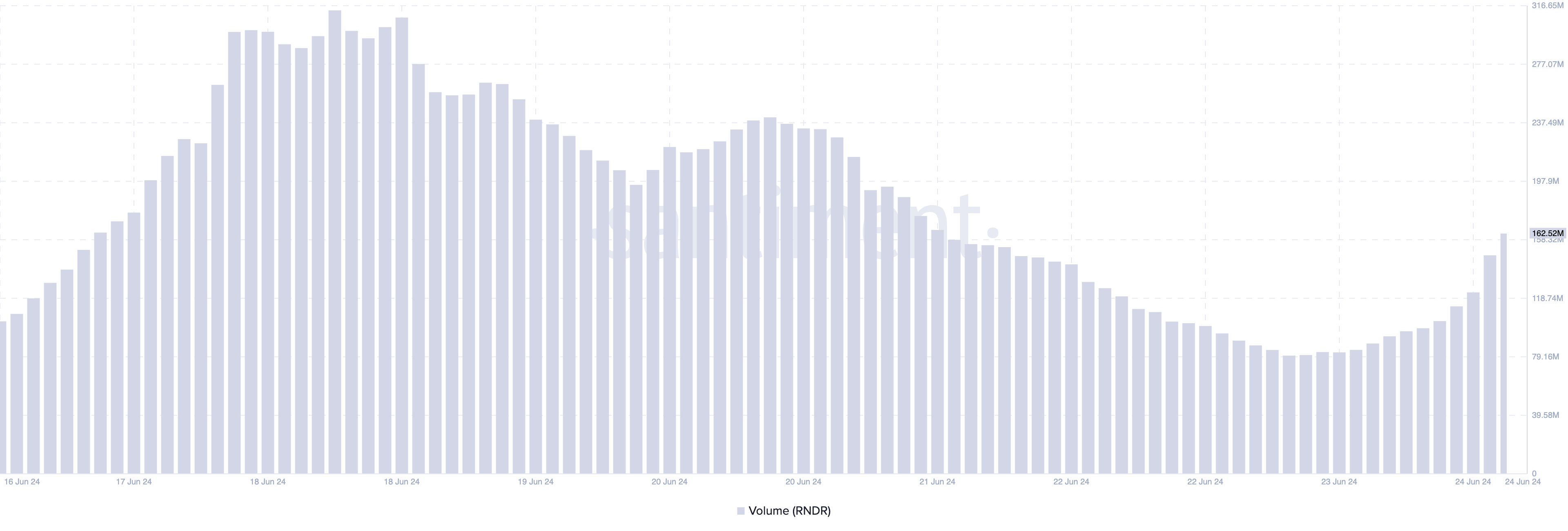 Volgens Santiment is het volume van RNDR de afgelopen 24 uur met maar liefst 105% gestegen. Op 23 juni bedroeg het volume van de token $78,17 miljoen. Op het moment van schrijven is dat $160,72 miljoen.