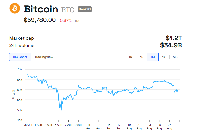 Gegevens van BeInCrypto tonen aan dat Bitcoin momenteel wordt verhandeld voor $59.780, een daling van 0,37% sinds de opening van de sessie op donderdag.