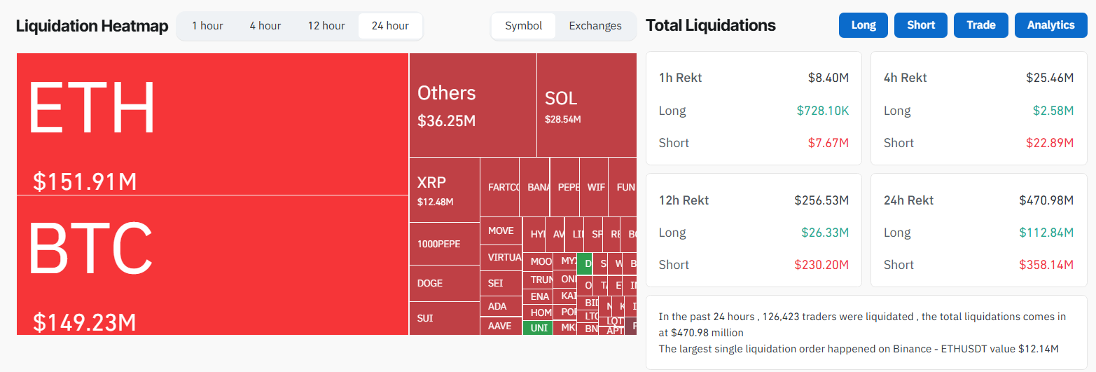 Volgens Coinglass werden de afgelopen 24 uur bijna $500 miljoen aan posities geliquideerd. Het merendeel hiervan kwam van shortposities, waarbij het totale short-liquidatievolume meer dan $358 miljoen bedroeg, drie keer het volume van longpositie-liquidaties.