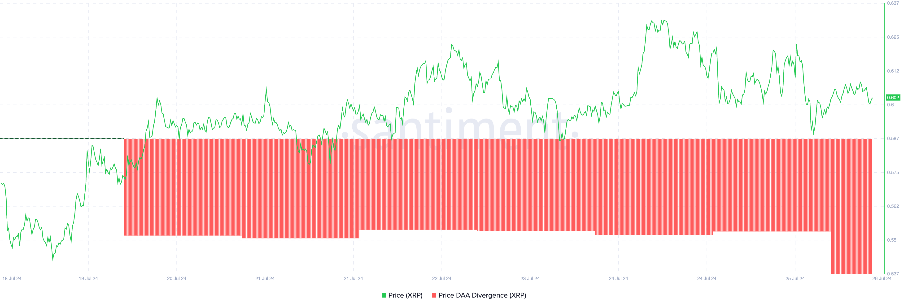 Deze negatieve divergentie suggereert dat de koers van XRP sterk beweegt ten opzichte van zijn gemiddelde dagelijkse handelsactiviteit.