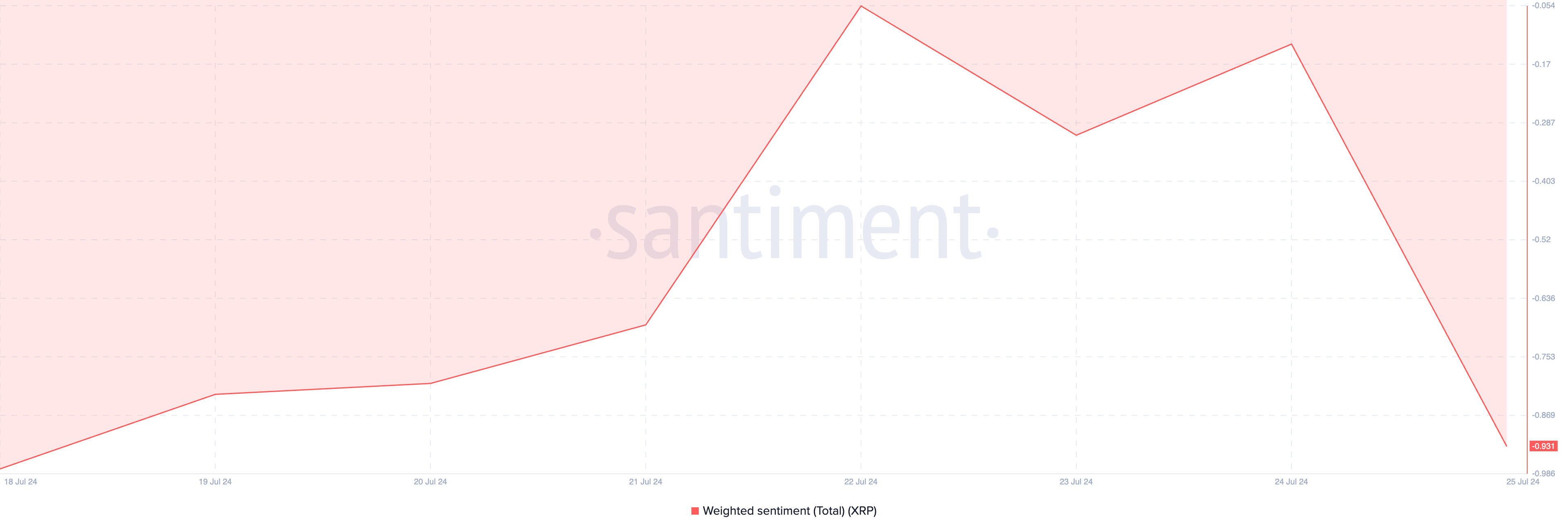 Op het moment van schrijven is het gewogen sentiment van XRP negatief op -0.93. Deze metriek volgt de algemene stemming van de markt met betrekking tot een asset. Wanneer de waarde onder nul is, geeft dit aan dat de meeste discussies over de asset in social media worden gevoed door negatieve emoties zoals angst, onzekerheid en twijfel. Dit wordt vaak beschouwd als een voorbode van een koersdaling.