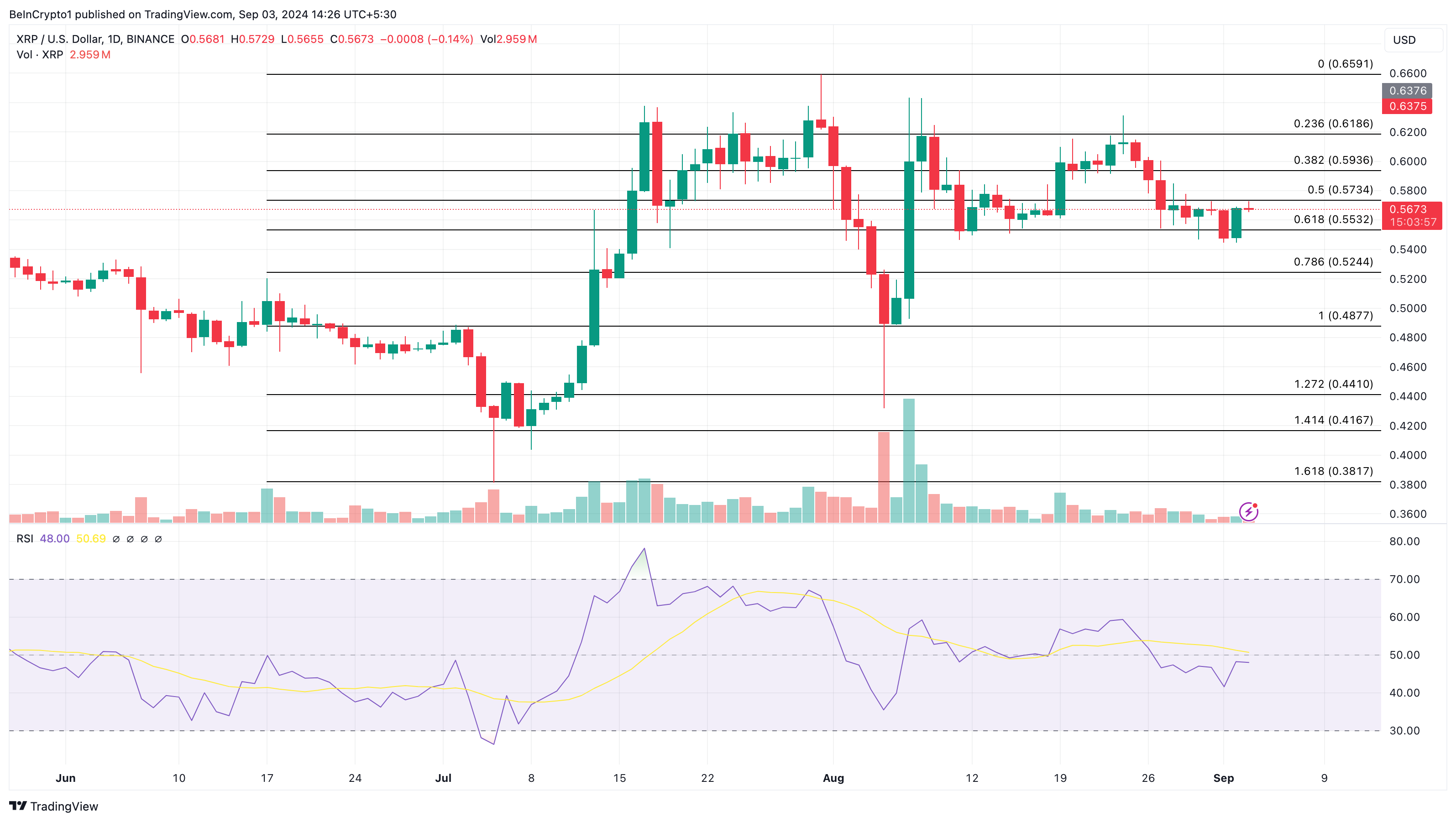 Een nadere blik op de dagelijkse grafiek laat zien dat XRP aanzienlijke verkoopdruk ondervond bij het naderen van $0,61. Hoewel het zich heeft hersteld van de daling naar $0,54, kan het moeite hebben om door de weerstand rond $0,57 heen te breken.