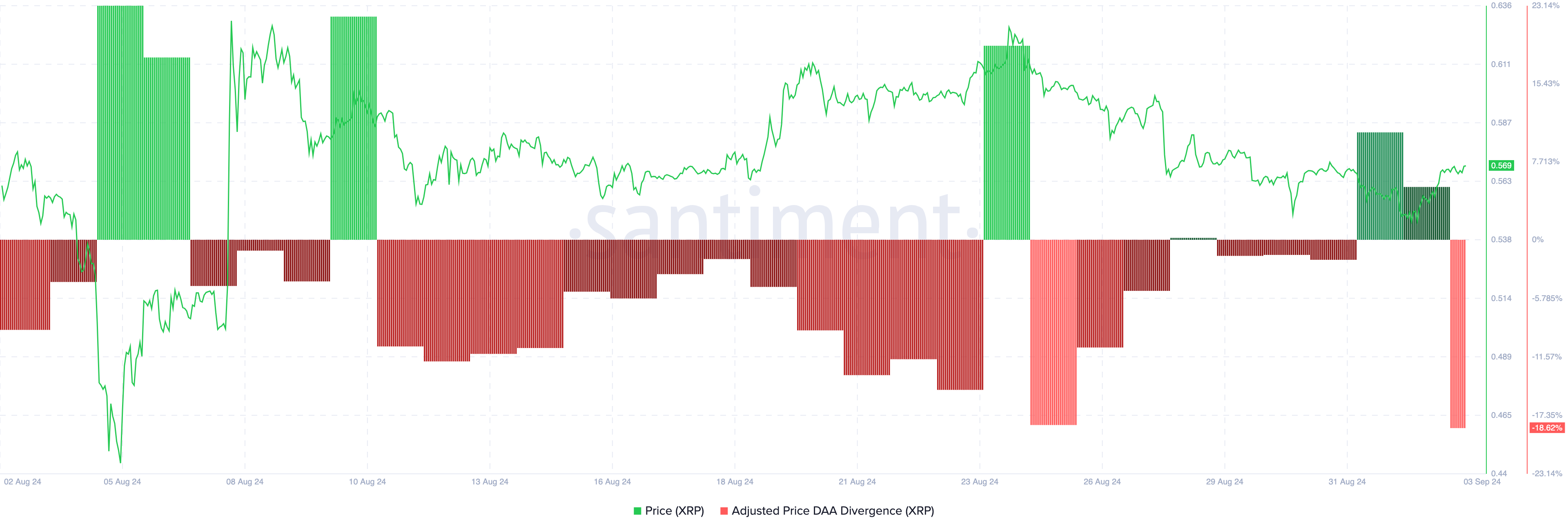 Op het moment van schrijven staat XRP op $0,56. Echter, de divergentie van dagelijks actieve adressen (DAA) is gedaald naar -18,62%, wat duidt op een afnemende gebruikersbetrokkenheid naarmate de koers stijgt.