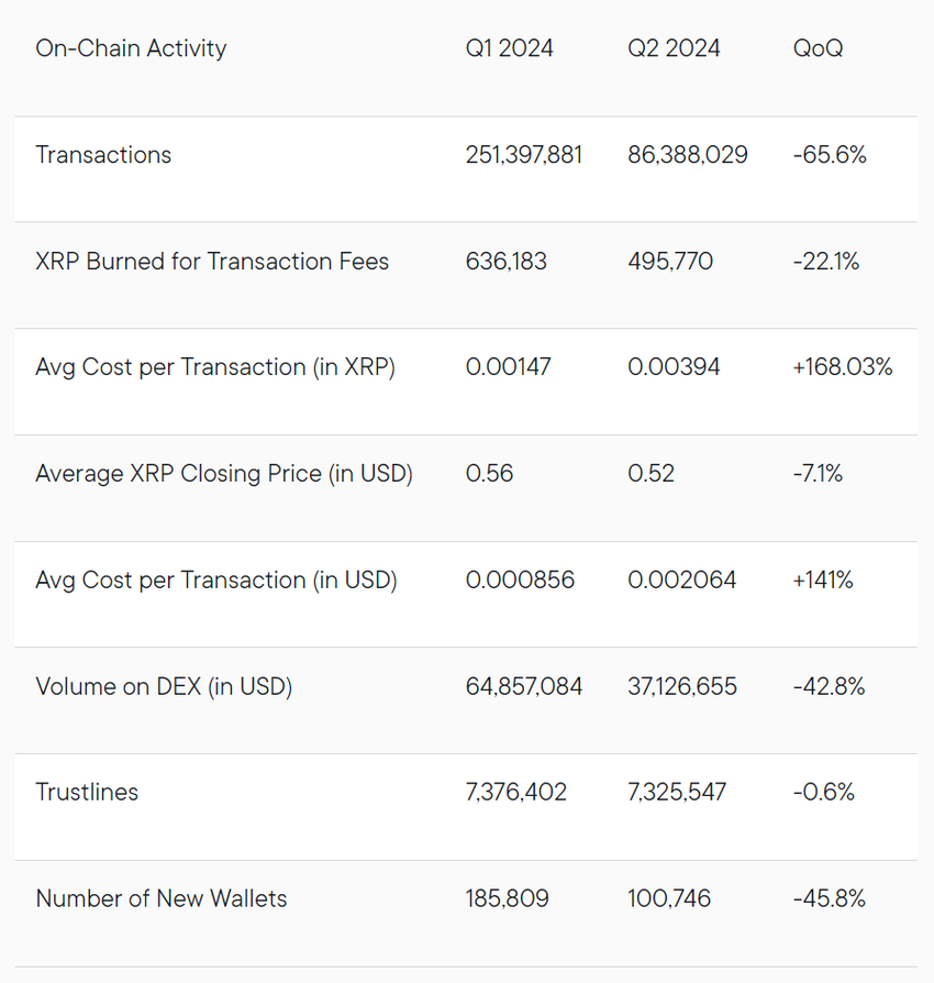 Ondanks de sterke basis van de XRP Ledger voor institutionele adoptie, heeft het enkele uitdagingen ondervonden, met name in on-chain activiteit. Een recent rapport onthulde dat in het tweede kwartaal van 2024 het aantal transacties op de XRPL met meer dan 65% daalde vergeleken met het eerste kwartaal. Deze afname is ook te zien in transactievolumes en algehele DEX-betrokkenheid, waar het handelsvolume met bijna 43% daalde.