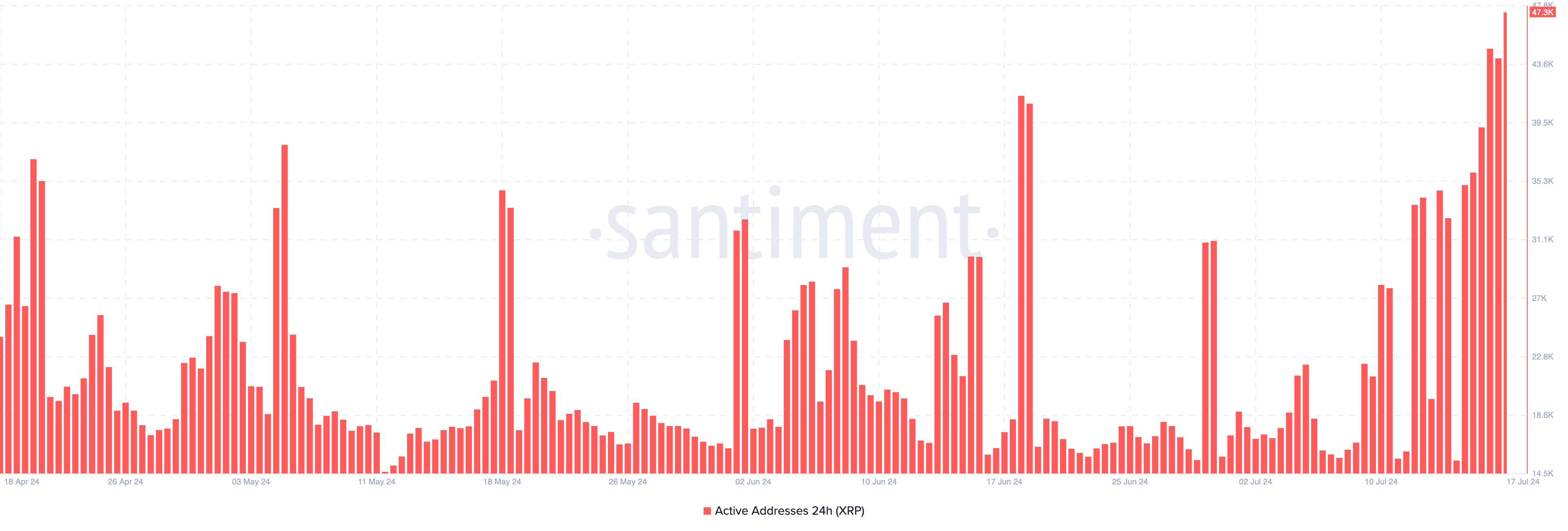 Voor het grootboek toonden on-chain data van Santiment aan dat 47.300 actieve adressen succesvolle XRP transacties deden tussen 17 en 18 juli.