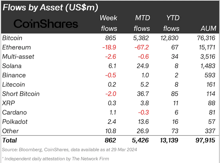 Polkadot (DOT) en Solana (SOL) hebben de afgelopen maand veel highere instromen genoteerd dan XRP. De instroom van DOT bedroeg $13,6 miljoen voor de maand maart; SOL noteerde $24,9 miljoen instroom van instellingen, terwijl XRP slechts $3,8 miljoen bedroeg.