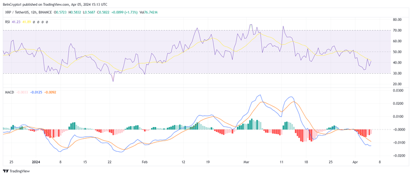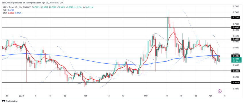 De koers van XRP die handelt op $0,58, noteert de vorming van een death cross op de 12-uur grafiek. Een death cross is bearish en treedt op wanneer een korte termijn 50-daags Exponentieel Bewegend Gemiddelde (EMA) onder een lange termijn 200-daags EMA kruist.