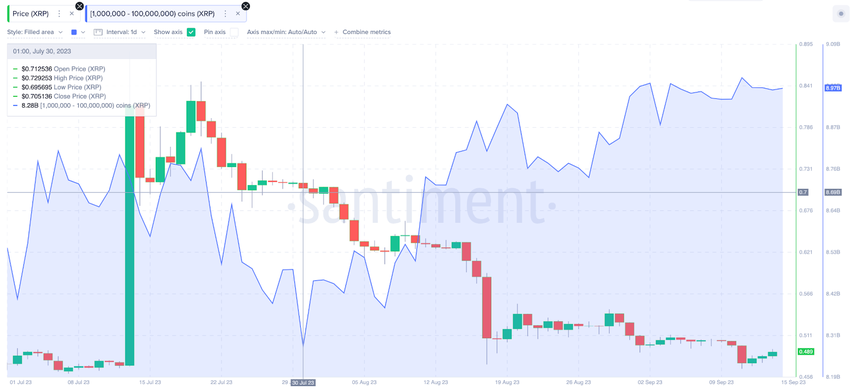 Na een twee maanden durende razernij om winst te nemen, is de prijs van XRP nu 40% gedaald vanaf de piek van $ 0,83 die op 13 juli werd geregistreerd. Maar interessant is dat on-chain gegevens onthullen dat een cluster van cryptowalvissen prompt terugkeerde naar de accumulatiemodus XRP zodra de prijs eind juli onder de $0,70 dook.