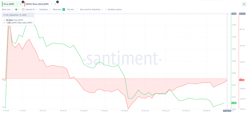 De Market Value to Realised Value (MVRV) data, die de netto financiële positie berekent van investeerders die XRP kochten in de afgelopen 30 dagen, bevestigt ook dit verhaal. Het laat zien dat, met prijzen die momenteel op $ 0,50 staan, de meeste cryptobeleggers die XRP in de afgelopen maand kochten 1,3% verlies zullen maken als ze vandaag verkopen.